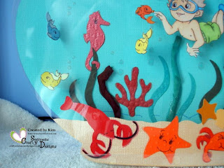 The fish bowl itself was cut out of acetate on my Cricut using the Everyday Paper Dolls Cartridge at 8.5" x 10" to give you an idea of the size. I then added various sea life from Pack Your Bags Cartridge. I embossed most of the cuts using various folders and added some faces to my cuts with the Peachy Keen Funshine Faces set. All of the cuts and images are attached with very fine fishing line, they then dangle and swing freely in the bowl. I used my Cri-Kit glitter pens in my Cricut to draw all the pieces before adding them as die cuts as they then look like shadows but unfortunately the camera hasn't picked this up. The bubbles all had glossy accents added to them.