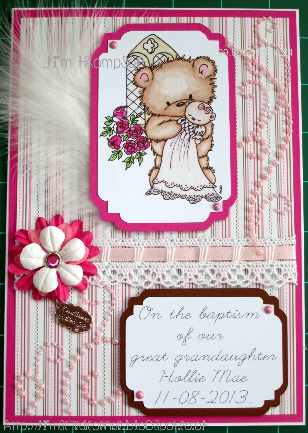 For my card I chose these My Minds Eye papers because of the butterflies and they are in colours that I would normally avoid but I actually had fun with them. I guess it is good to be out of our comfort zone at times, because of my back and such I coloured this adorable Elisabeth Bell image over a whole week! and each section I coloured I kept thinking I'm not sure about these colours but I can't possibly start again lol By the end I was glad I had stuck with it, had it of been coloured under normal circumstances it would of gone in the bin after just colouring the flower without a second thought so I guess my health was actually a positive in this case lol. Enough of the rambling, I added glamour dust to her fairy wings after lightly colouring. The bobble trim is also from My Mind's Eye, it was a kit I had a couple of years ago but cannot remember the name of and then the white ribbon was in my stash.